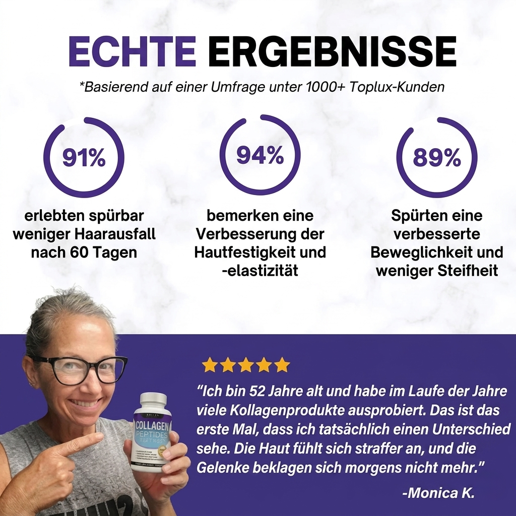 Toplux Collagen Peptides Ă€r hydrolyserat för maximal absorption och innehĂ„ller alla fem kollagentyper â Typ I och III för hud, hĂ„r och naglar, Typ II för leder och brosk, Typ V och X för bindvĂ€vnad, hĂ„rvĂ€xt och ben.